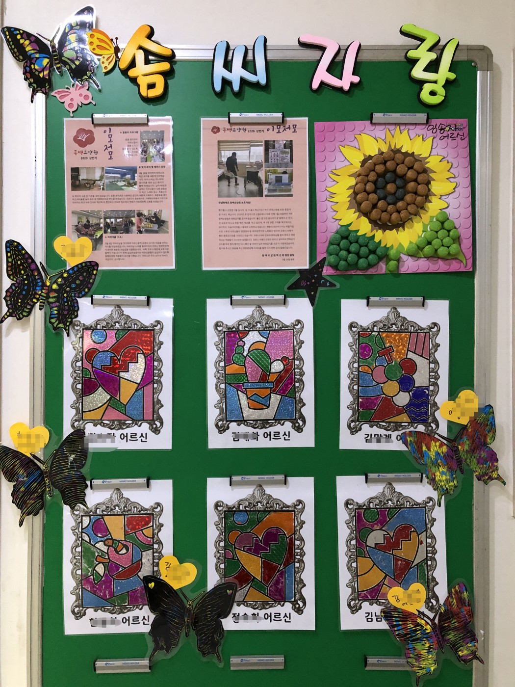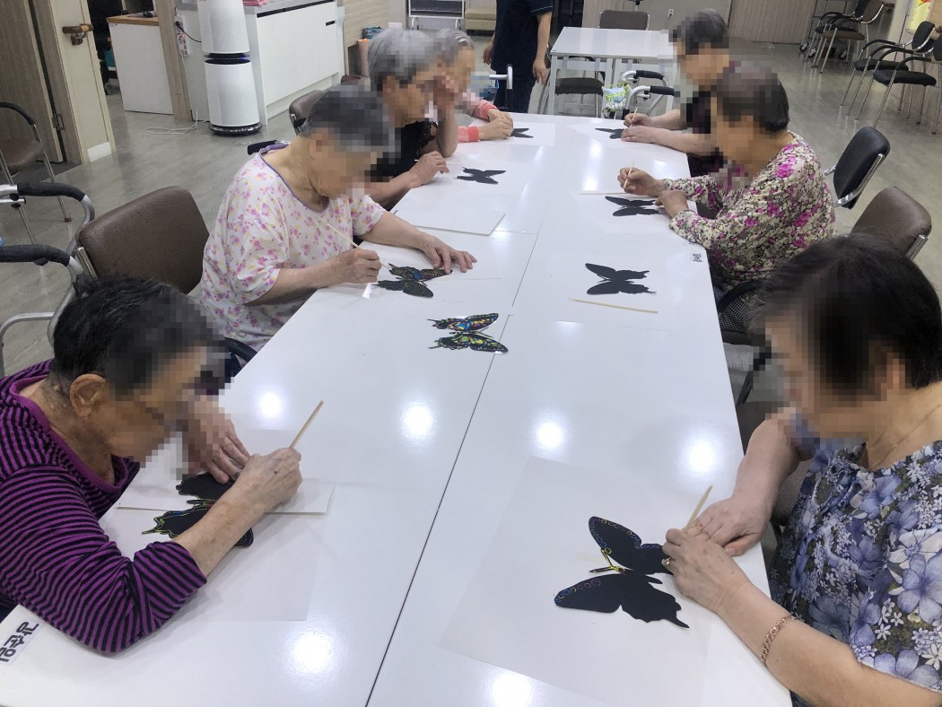 7월 미술치료 스크래치아트 관련링크 이전글 다음글 목록 본문 스크래치아트를 해 보았습니다. 긁으면 검정색에서 알록달록 색이 나오니 어르신들이 신기해 하셨습니다. 서로 호랑나비이니 배추나비이니 나비 이름도 짓어주고, 호랑나비 노래도 부르며 즐거운 시간을 가졌습니다. 미술치료 시간에 만드는 작품들은 어르신들 방에 전시가 되거나 혹은 현관앞 솜씨 자랑에 전시가 됩니다~^^ 이전글 다음글 목록